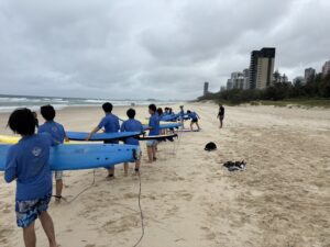ブリスベン空港到着後、現地校で現地の生徒と顔合わせをし、その後ホストファミリーに連れられて約1週間に及ぶホームステイの生活がスタートしました。翌日からは現地校の授業に参加する語学研修を開始。プログラム後半は現地校で修了証を受け取り、ホストファミリーに別れを告げてから、サーファーズパラダイスにある海を見渡すホテルに移動しました。そこからは生徒が楽しみにしていたフィールドワークです。美しいゴールドコーストの海でサーフィン体験をするグループと、コアラやカンガルーなどオーストラリアを代表する動物と出会えるカランビンワイルドライフサンクチュアリに行くグループに分かれ、いずれも有意義な時間を過ごしたようです。夕方は海やショッピングモールなど自由に街を散策する時間をつくりました。日本語の通じない国での買い物や飲食はそれだけでも貴重な体験です。